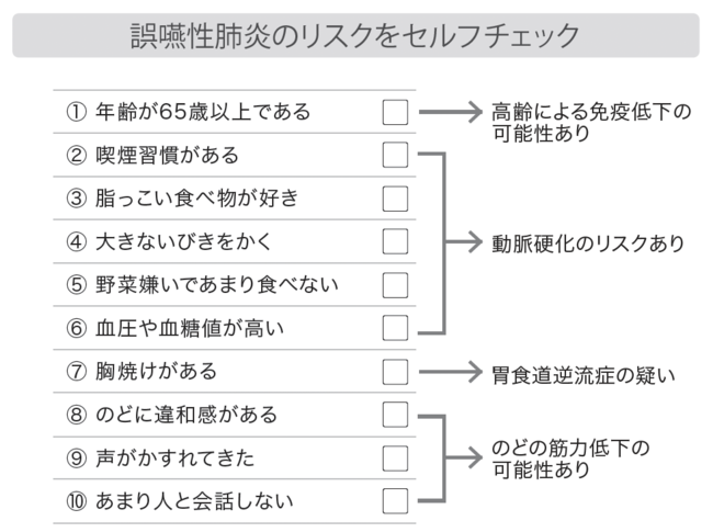 誤嚥性肺炎を起こすリスクがあるかどうかを自分で確認することが目的のチェックリストです。